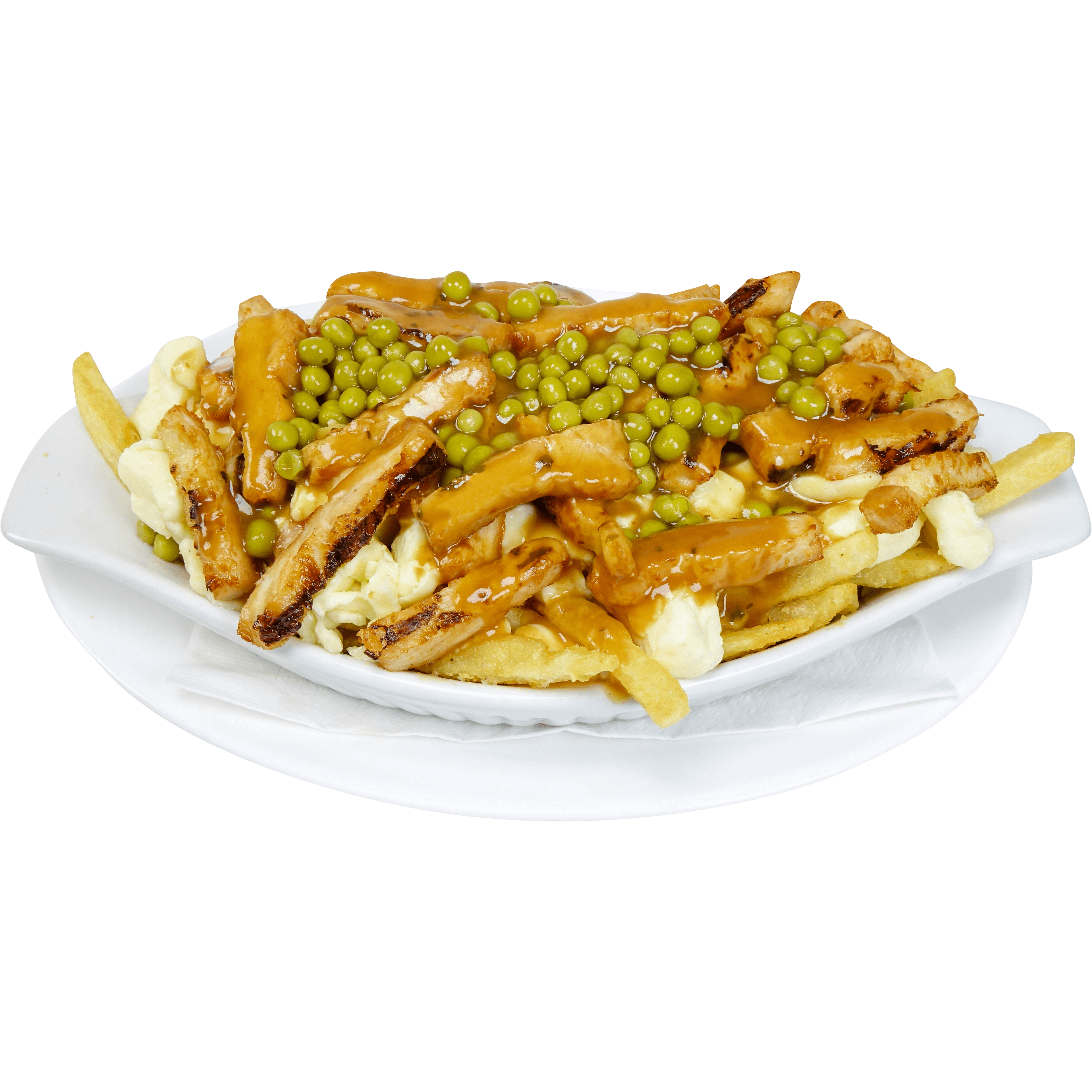 frites, sauce brune, poulets, petit pois et fromage en grains
