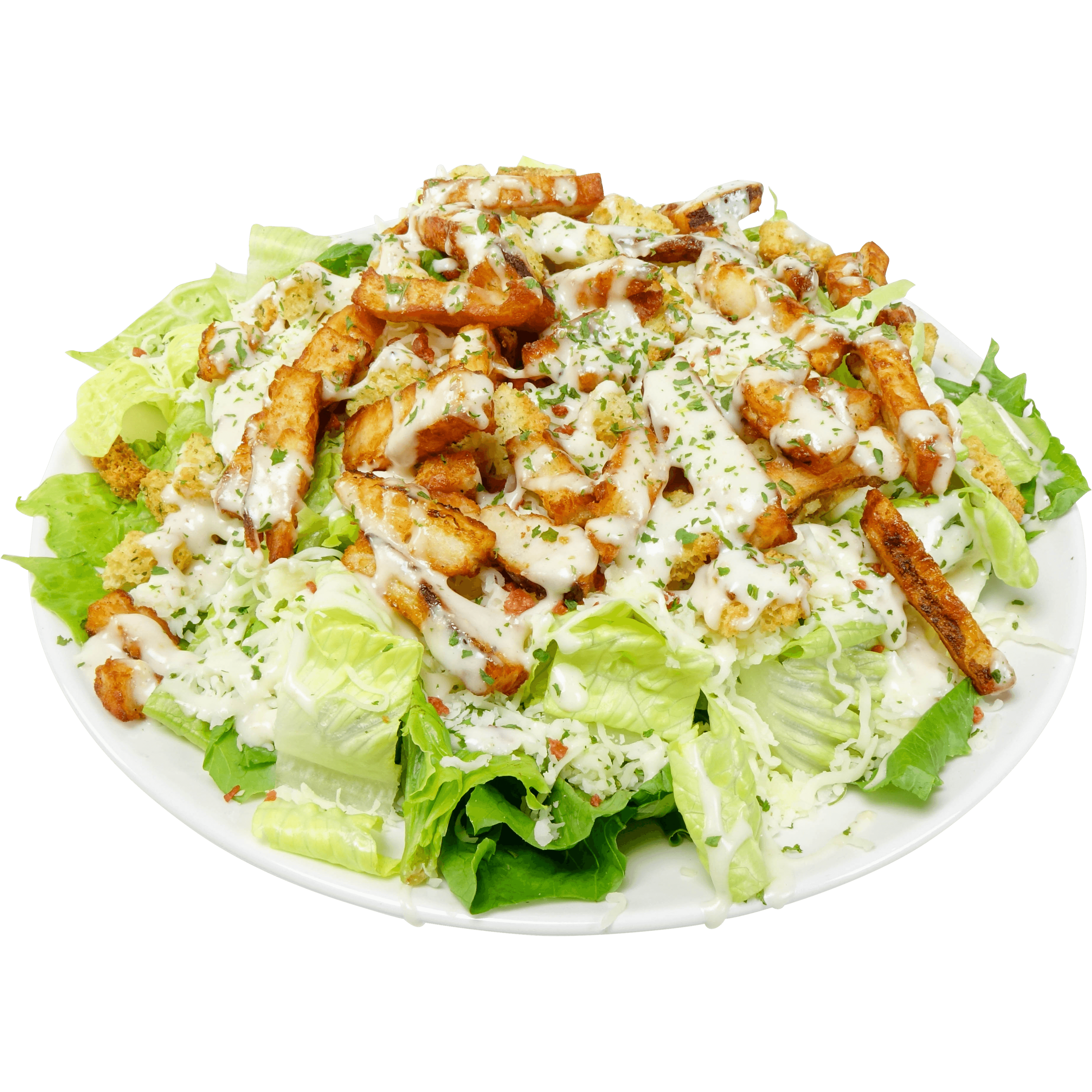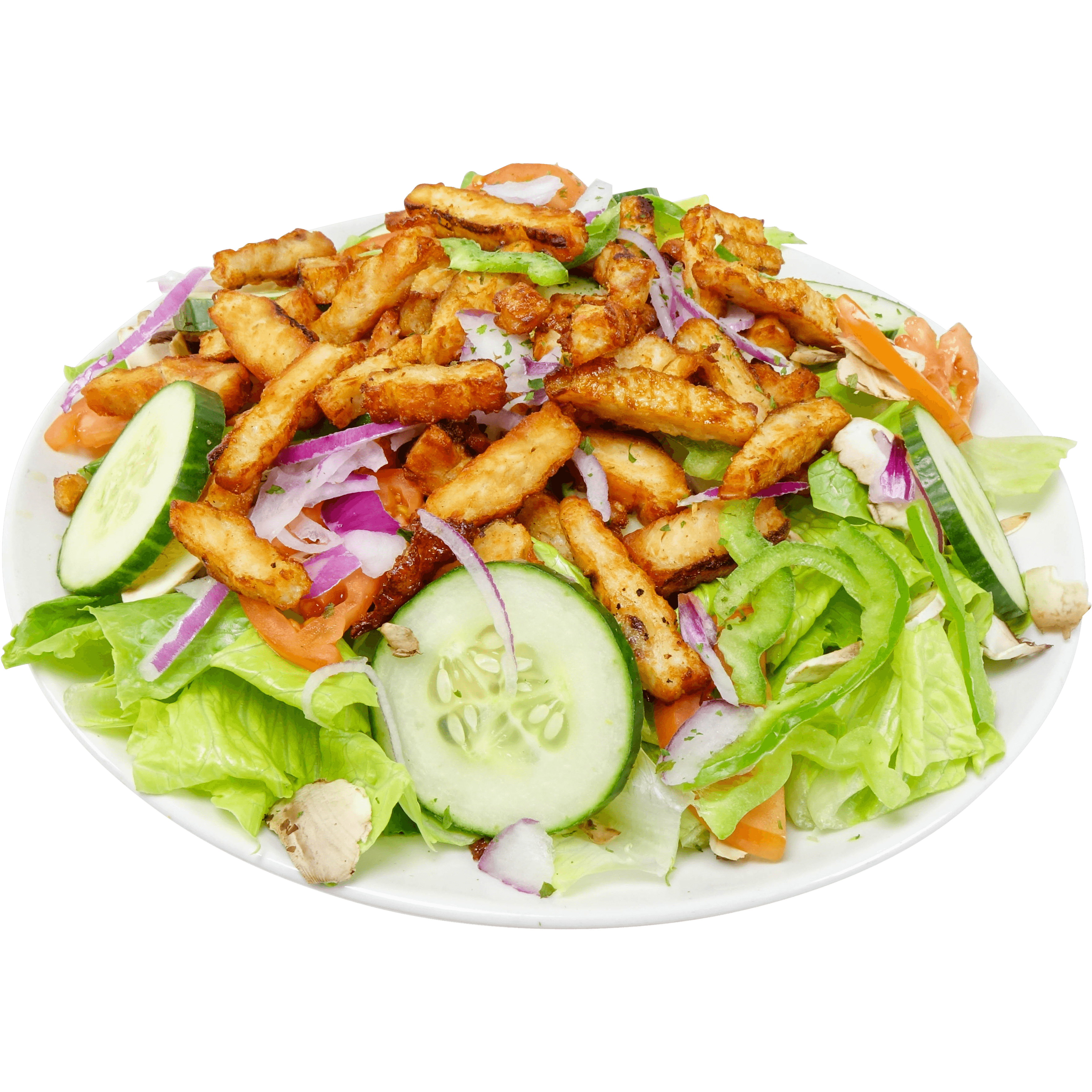 salade, champignons, poivrons verts, carottes, céleris, choux, tomates, oignons, lanières de poulet et vinaigrette du chef