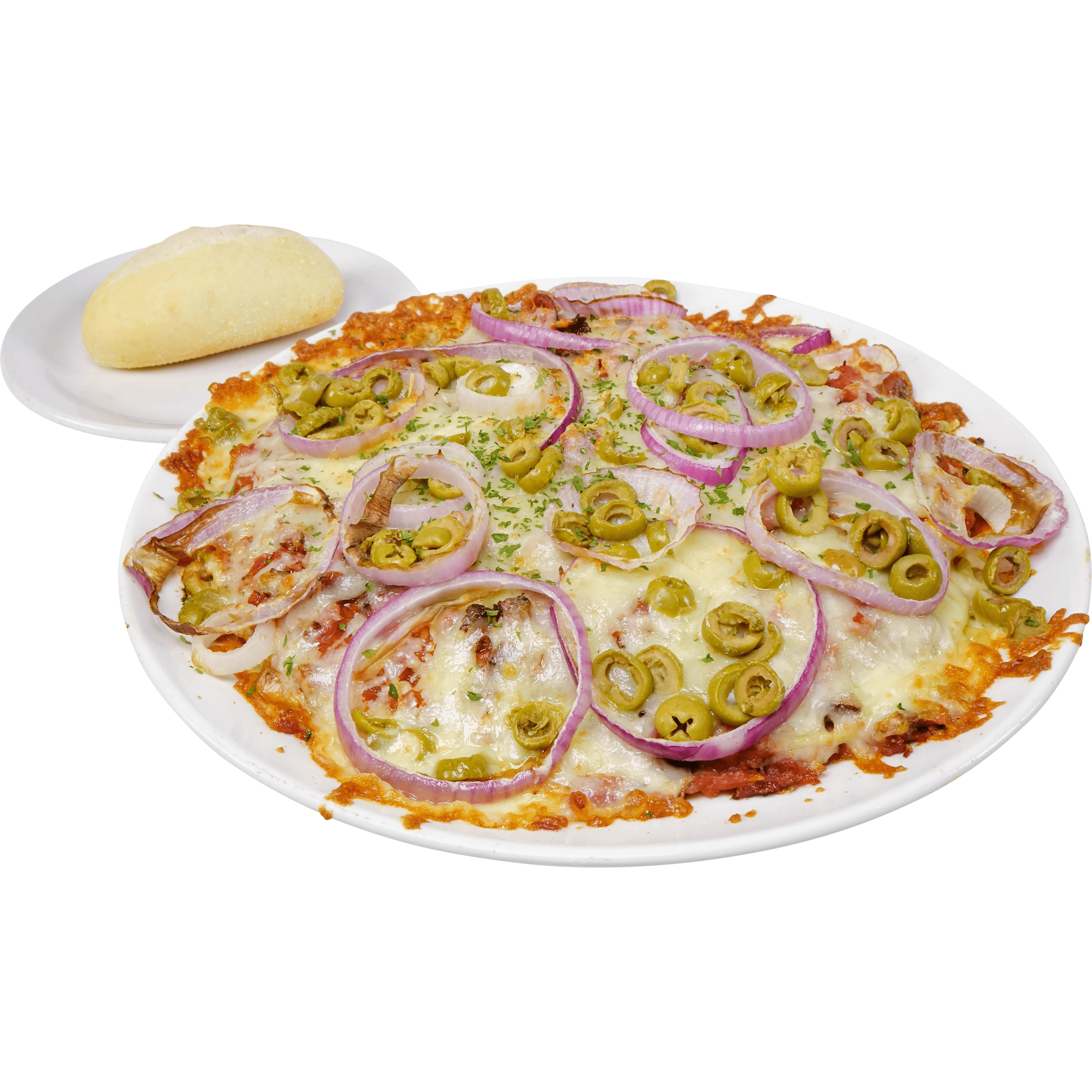 sauce à pizza, mozzarella, poivrons, oignons, tomates, olives vertes et noires, fromage feta