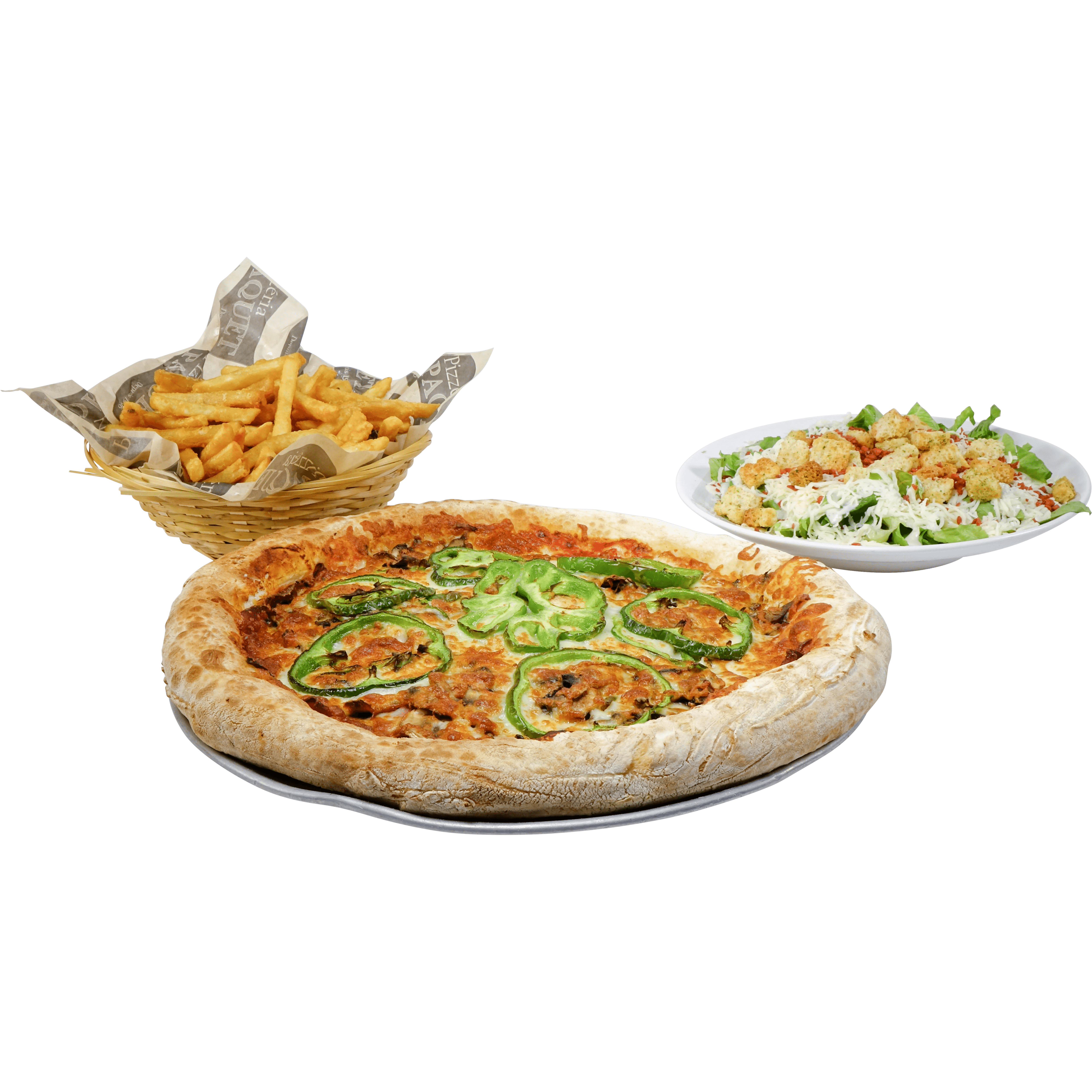 4 à 6 personnes 1 x pizza 14 pouces garnie ou pepperoni 1 x grosse frite 1 x 2 litres liqueur (Coke ou Sprite)