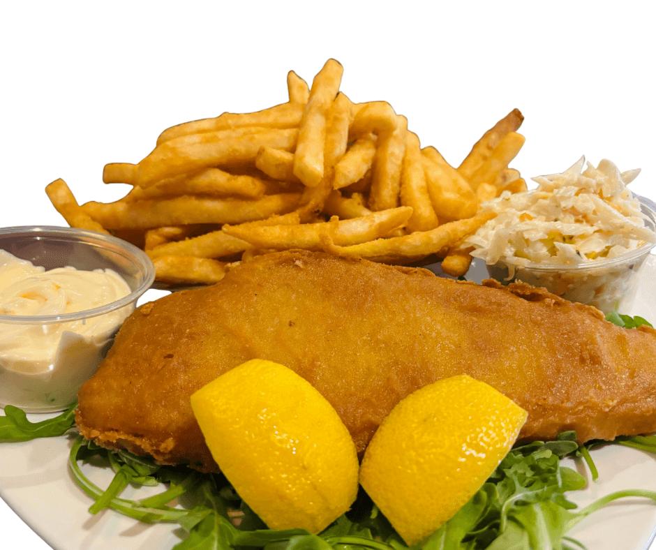 Morue panée à la bière, sauce tartare, citron , salade de choux, choix d'accompagnement